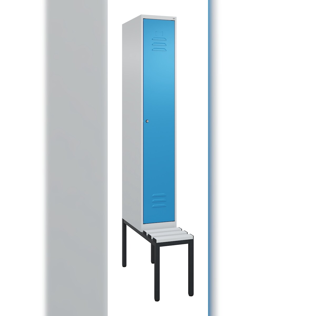 C+P Spind Classic PLUS, Kunststoff untergebaute Sitzbank, 1 Abteil, HxBxT 212x30x82cm, Zylinderschloss, Hellgrau/Lichtblau von PROREGAL