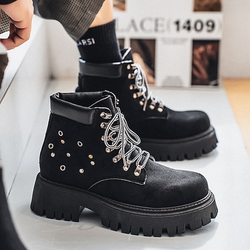 stivali da uomo in pelle scamosciata color cuoio con lacci, dettagli borchiati e suola spessa: calzature robuste ed eleganti per avventure all'aria aperta, escursioni e abbigliamento casual