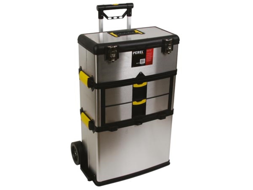 Perel Werkzeugwagen 3-in-1, robuster Edelstahl-Trolley, ausziehbarer Teleskopgriff, große Räder, 3 abnehmbare Fächer,570x354x830mm.