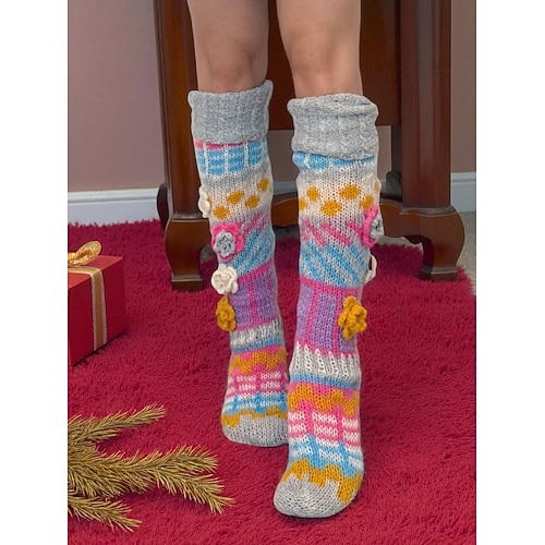 calzini lunghi fino al ginocchio da donna all'uncinetto con motivo granny square a tema natalizio, design lavorato a maglia multicolore per le feste e la moda invernale