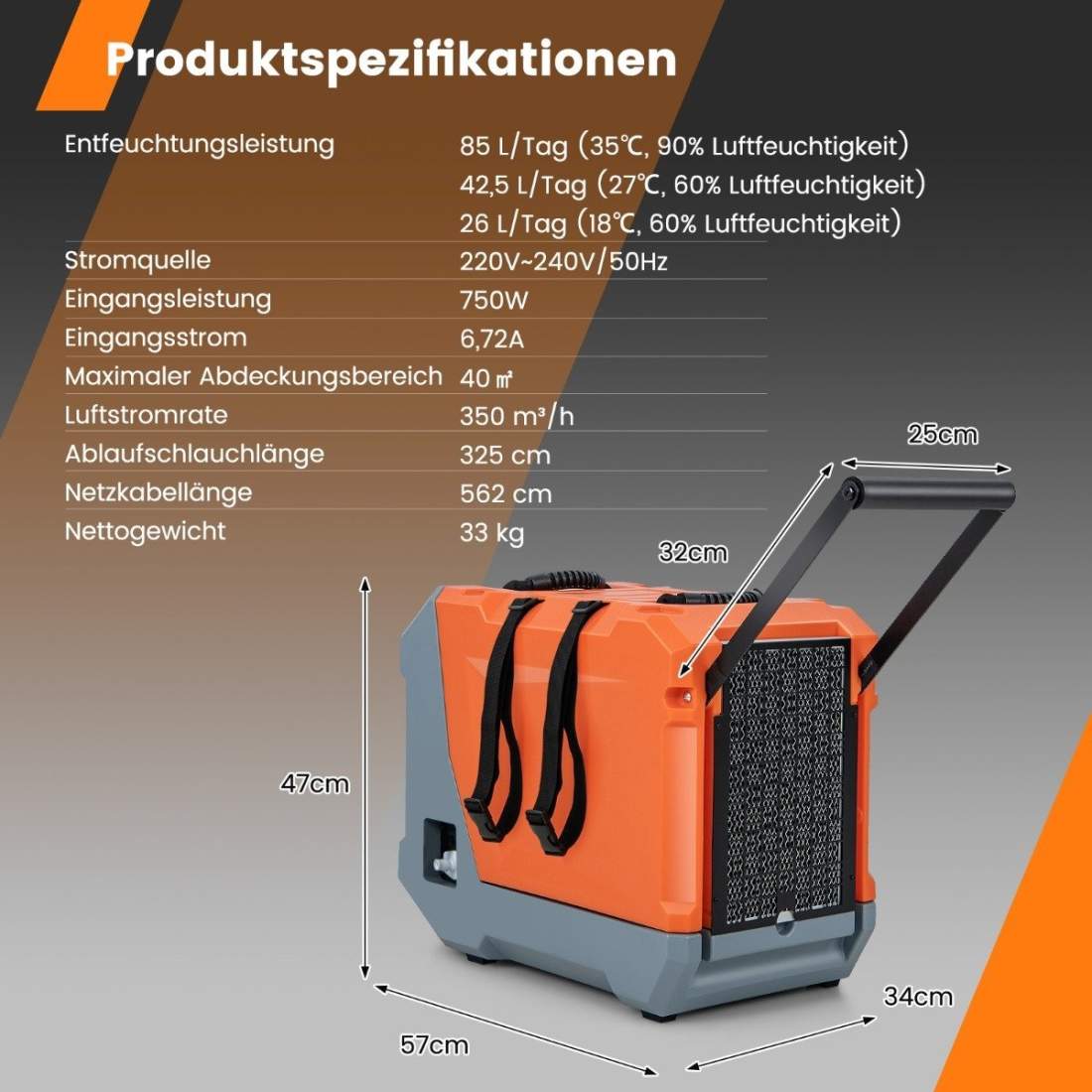 85 L/dag affugter byggetørrer med pumpe og afløbsslange industriel tørreanordning med 24H timer orange + grå