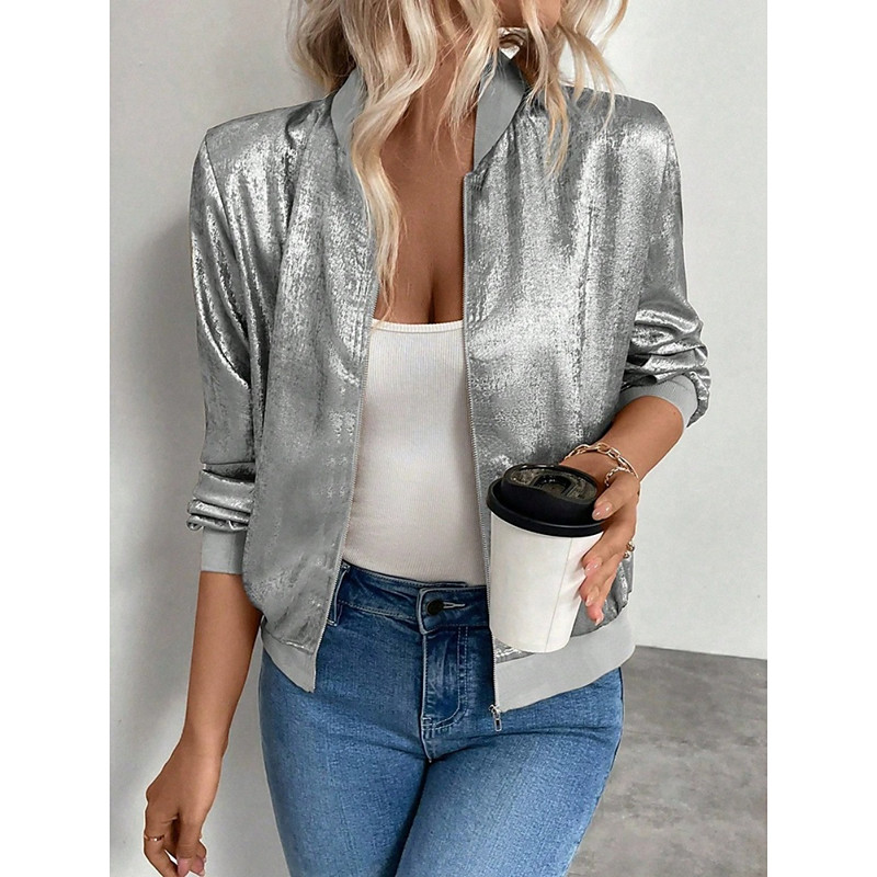 Women's Bomber Jacket Casual Jacket Comfortable Breathable Zipper Casual Plain Vacation Street Casual Daily Wear Zipper Short Stand Collar Regular Fit Long Sleeve Outerwear Silver Black Pink Spring