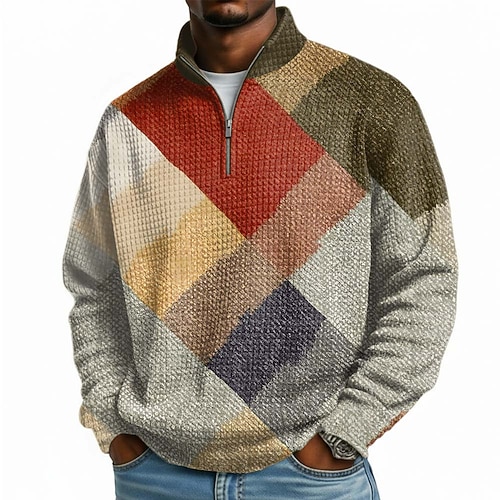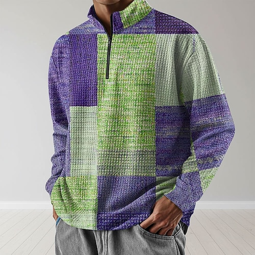 Per uomo Geometrico Plaid Nido d'ape Felpa Moda Quotidiano Classico Casual Collo alla coreana Zip a un quarto All'aperto Casa Ufficio Lavoro Blu Viola Verde Cachi Con zip Autunno Inverno progettista
