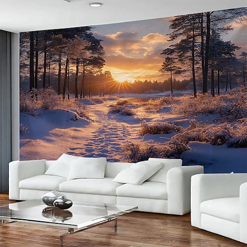arazzo con paesaggio invernale, foresta, sole e neve, grande decorazione murale da appendere alla parete, tessuto per sfondo fotografico, arredamento per la casa, camera da letto, soggiorno o ufficio