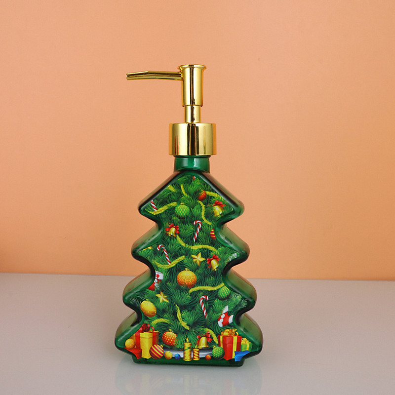Glass Christmas Tree Hand Pump Dispenser Bottle - 300ml Red/Green Reusable Travel-Sized Soap/Lotion/Cleanser Container with Golden Reindeer Snowflake Design for Kitchen, Bathroom, Office - Durable