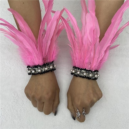 Accessori Samba Carnevale 2026 Rio Carnevale Polsini Piume Nere Donna con Pizzo di Perle 1 Paio di Braccialetti Piuma Naturale Costume per Festival in Brasile