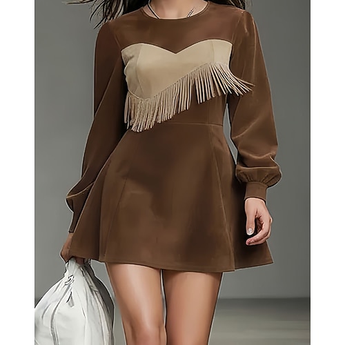 Per donna Mini Abito Vestito Casual Abito Boho Elegante Vintage Moda Quotidiano Uscire Weekend Vestibilità regolare Blocco di colori Manica Lunga Girocollo Marrone Primavera Autunno Inverno