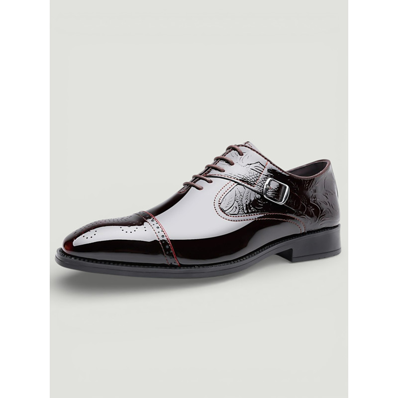 Men's Glossy Burgundy Patent Faux Leather Lace-Up Dress Shoes with Brogue Detailing - Formal Oxford Shoes for Weddings, Parties, and Business Events