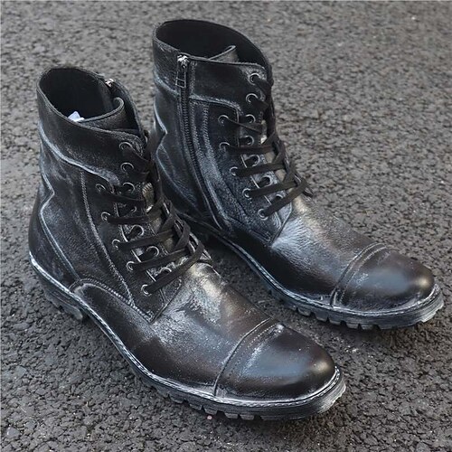 stivali da combattimento da uomo in pelle di vacchetta nera: calzature in pelle con lacci resistenti in stile militare per escursioni all'aperto, motociclismo e abbigliamento casual da strada