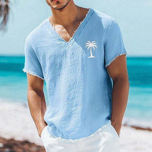 Herren-T-Shirt mit Palmenprint aus Leinen-Baumwoll-Mischgewebe, V-Ausschnitt, offene Kanten, altrosa, sommerliches Strandurlaubs-Shirt mit Fransen, weiches Designer-Top, Größen S-3XL