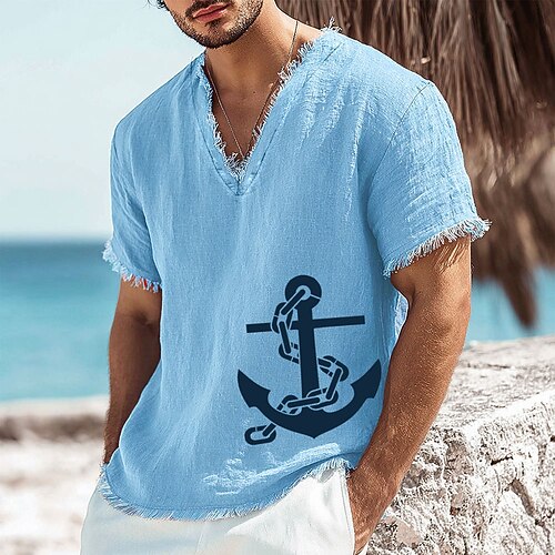Großes Herren-T-Shirt mit nautischem Ankerkettenmuster aus Leinen-Baumwoll-Mischgewebe, V-Ausschnitt, offene Kanten, Sommer-Strandurlaub-Segelshirt, ausgefranstes, weiches Freizeittop, Größen S-3XL