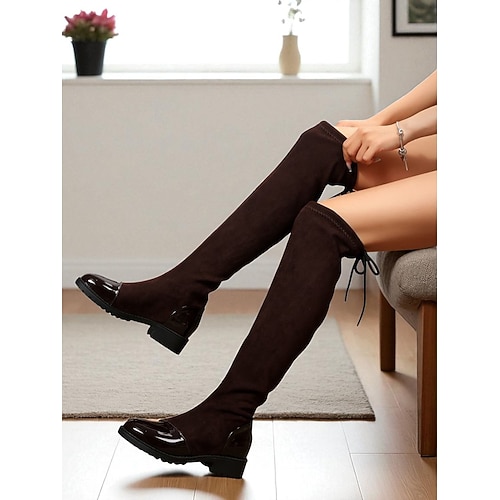 stivali neri sopra il ginocchio da donna con punta in vernice: stivali alti elasticizzati casual chic da indossare tutti i giorni, feste e moda di strada