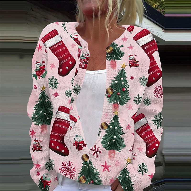 Women's Sweater Cardigan Elegant Fashion Cute Floral Graphic Christmas Tree Crew Neck Buttons Knitted Print Long Sleeve Regular Tops Knit Christmas Outdoor Home White Light Green Fall Winter