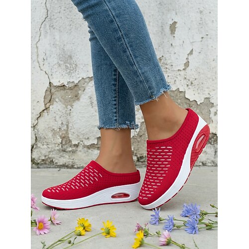 muli sportivi casual rossi da donna con plateau e cuscino d'aria - tomaia in mesh traspirante, scarpe da passeggio leggere e comode per le donne, perfette per l'uso quotidiano, viaggi, shopping,