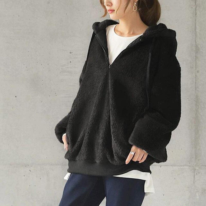 Women's Solid Color Warm Teddy Fuzzy Long Sleeve Hoodie Half Zip Regular Tops Street Casual Half Zipper Quarter Zipper Drawstring Front Pocket Black Wine Dark Gray Coffee Gray Fall Winter