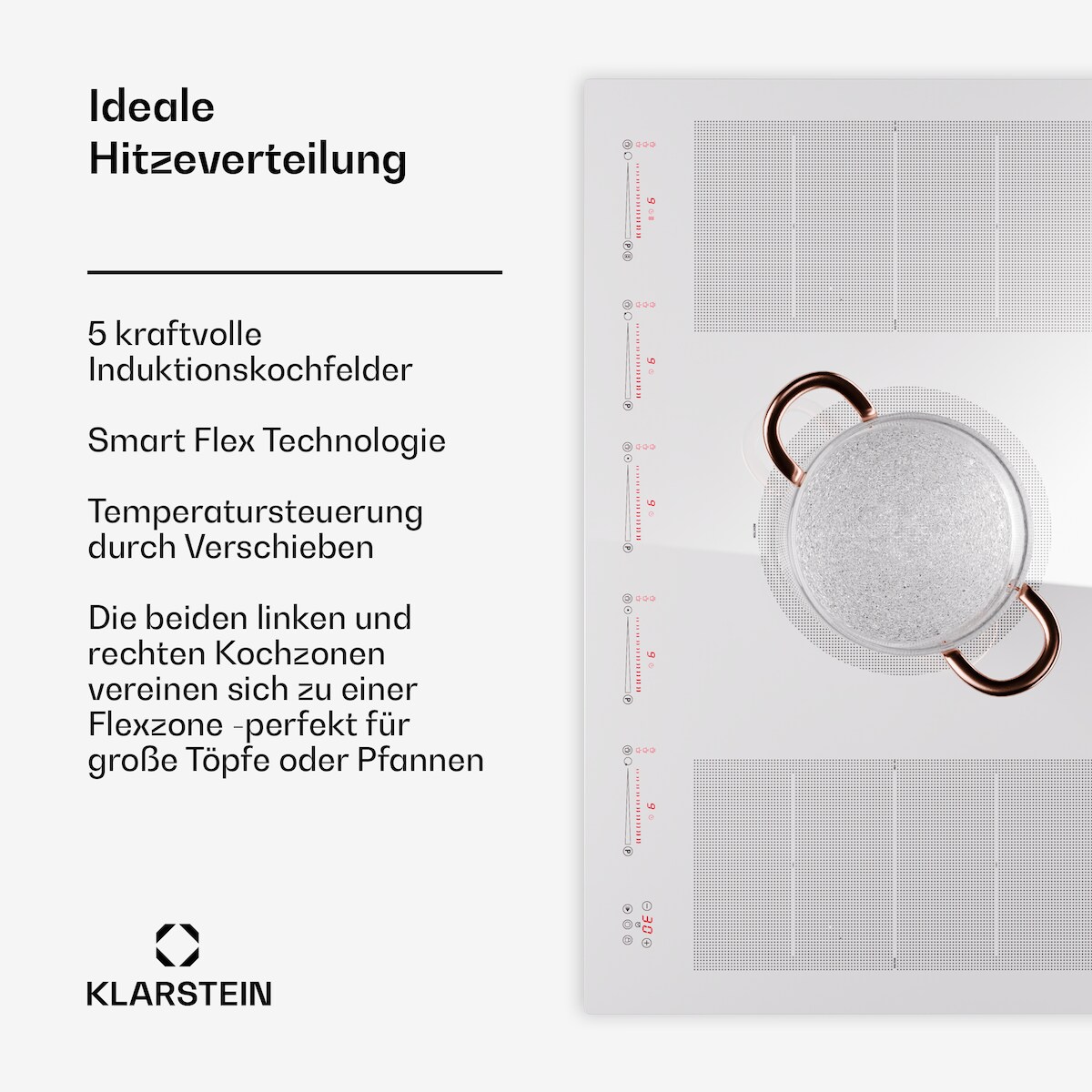 Klarstein Masterzone 90 Flex Induktionskochfeld Einbau 5 Kochzonen 2 Flex-Zonen ThermoBoost Smart Flex Technology max. 12600 Watt Weiß