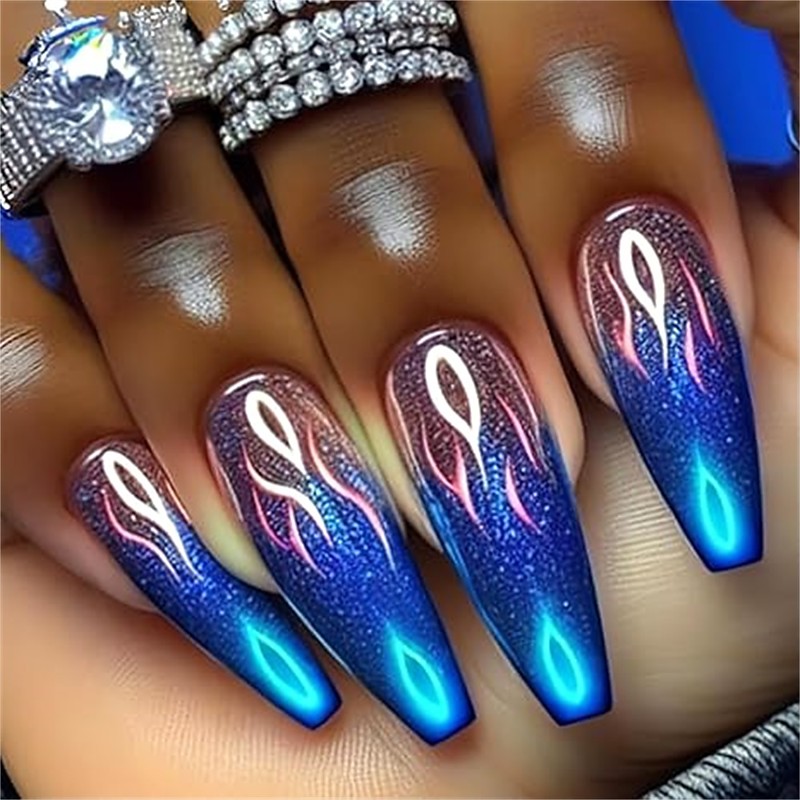 24Pcs Long Press on Nails Coffin Fake Nails with Blue Flame Designs Acrylic False Nails Blue Glossy Glue on Nails Halloween Artificial Nails Reusable Full Cover Stick on Nails for Women