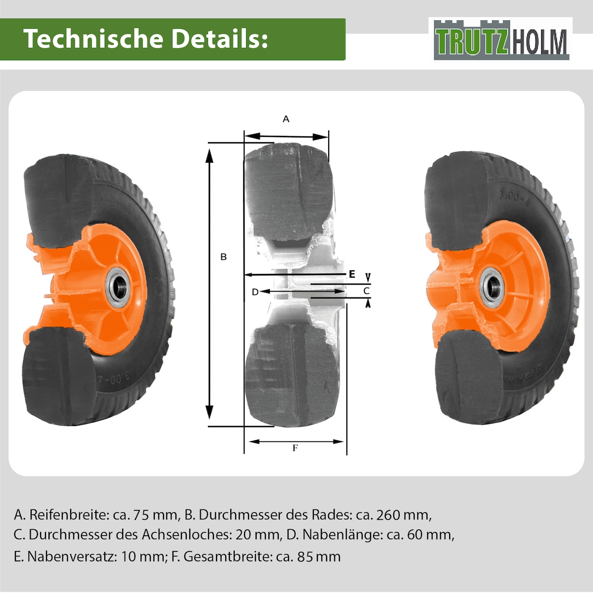 Baumarktplus Sackkarrenrad PU-Rad 260x85 mm 3.00-4 60 mm versetze Nabe Ø 20 mm orange Vollgummi Bollerwagen