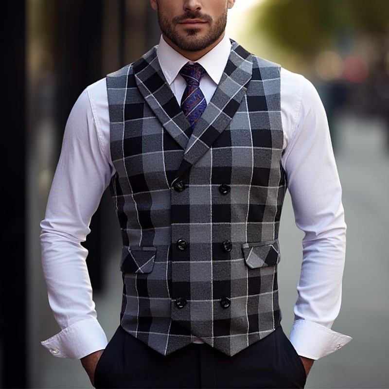 Men's Vest Waistcoat Cocktail Attire Formal Wedding Vacation Business Fashion Classic Spring Fall Pocket Buttons Polyester Comfortable Plaid Single Breasted V Neck Regular Fit Black Brown Khaki Gray
