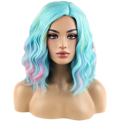Bunte, türkisfarbene, kurze, lockige Wellenperücke für Damen und Mädchen. Die hitzebeständige Kunsthaarperücke in Petrolblau eignet sich perfekt für Cosplay, Kostümpartys oder den Alltag.