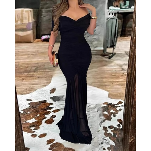 Per donna Mini Abito Abito in Raso Abito nero Vestito da Festa Abito da Cocktail Moda Moderno Festa serale Feste Cocktail party Vestibilità regolare Semplice Manica Lunga Top con spalle scoperte Nero