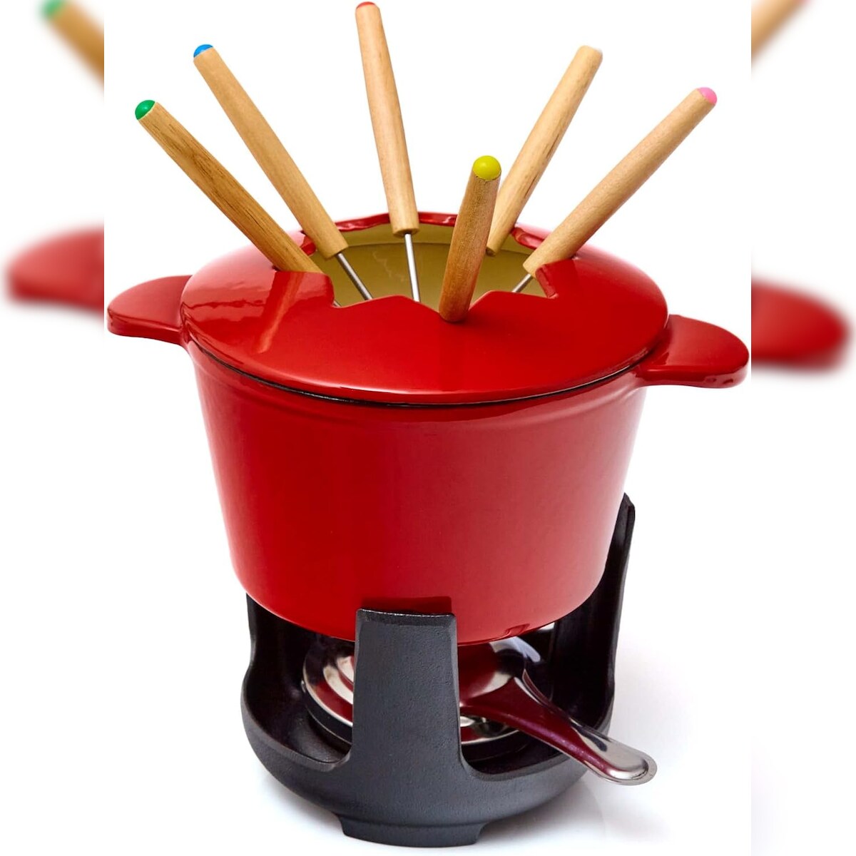 Bonvivre® Gusseisen Fondue Set für 4 Personen | 1 Liter | Fondueset 9-teilig mit Brenner und 6 Gabeln | Emailliert Rot