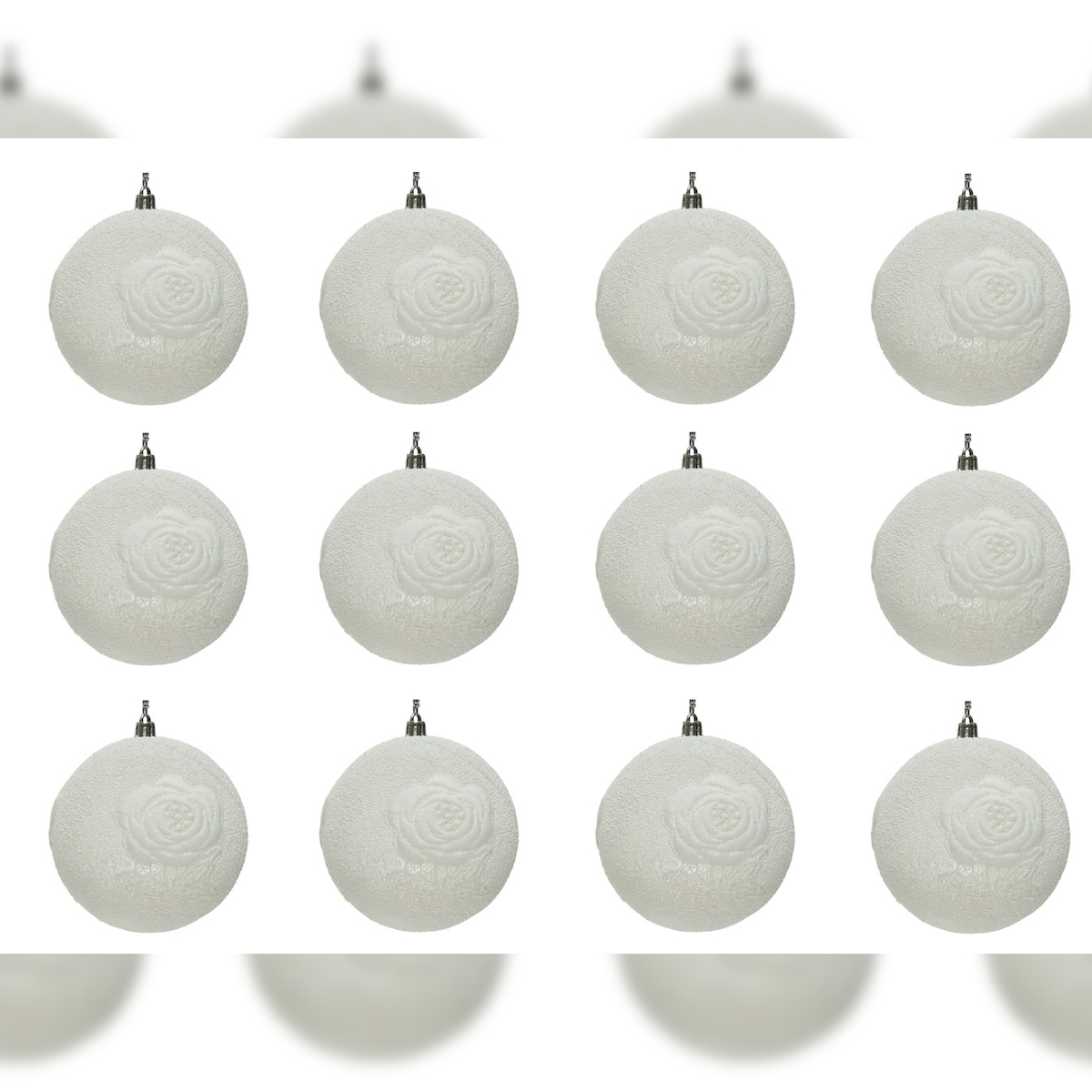 12 Weihnachtskugeln 10cm Kunststoff Rosen Prägung Muster Christbaumkugeln weiß