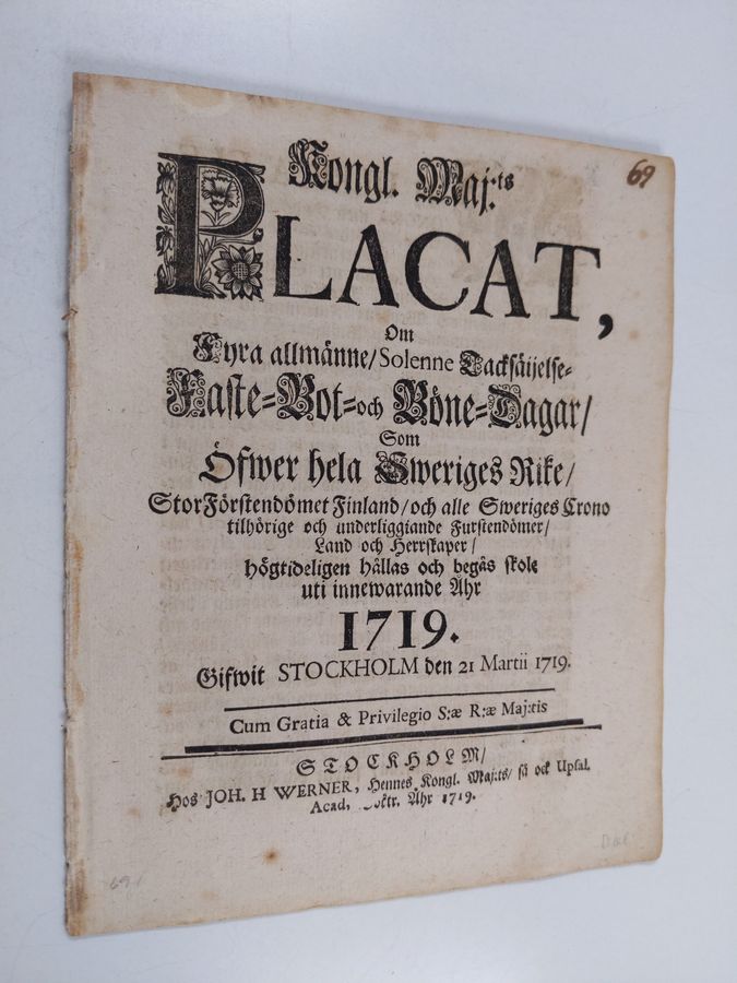 Kongl. maj:ts placat, om fyra allmänne, solenne tacksäijelse- faste- bot- och böne-dagar, som öfwer hela Sweriges rike, stor-furstendömet Finland, ...