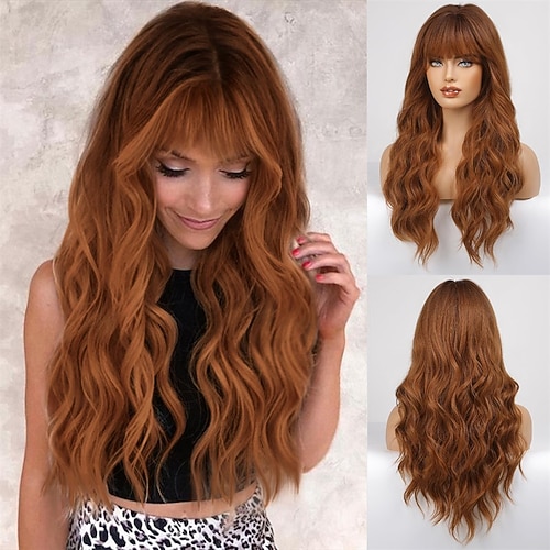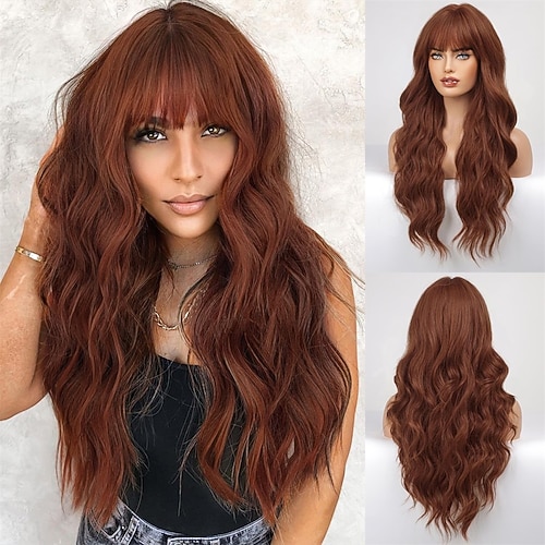 Parrucca rossa lunga 24 pollici con frangia per donna, parrucche ricce ondulate parrucche sostitutive dei capelli in fibra sintetica resistente al calore per cosplay festa di Halloween abbigliamento
