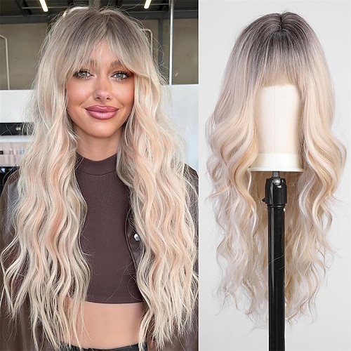 parrucca lunga rosa ondulata per le donne parrucca rosa ombre radice scura 26 pollici con frangia parrucca riccia ondulata parrucca in fibra sintetica resistente al calore dall'aspetto naturale per