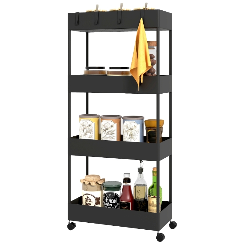 OKWISH Rollwagen Küchenregal 40x19x90 cm mit 4 Ebenen und Bremsrollen Schwarz schmaler Nischenwagen mit Haken, stabil und flexibel nutzbar