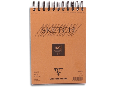 Clairefontaine skitseblok A5 - 100 ark, hvidt skitsepapir, 90 gram, topspiral, perforeret, med tyk papbagside