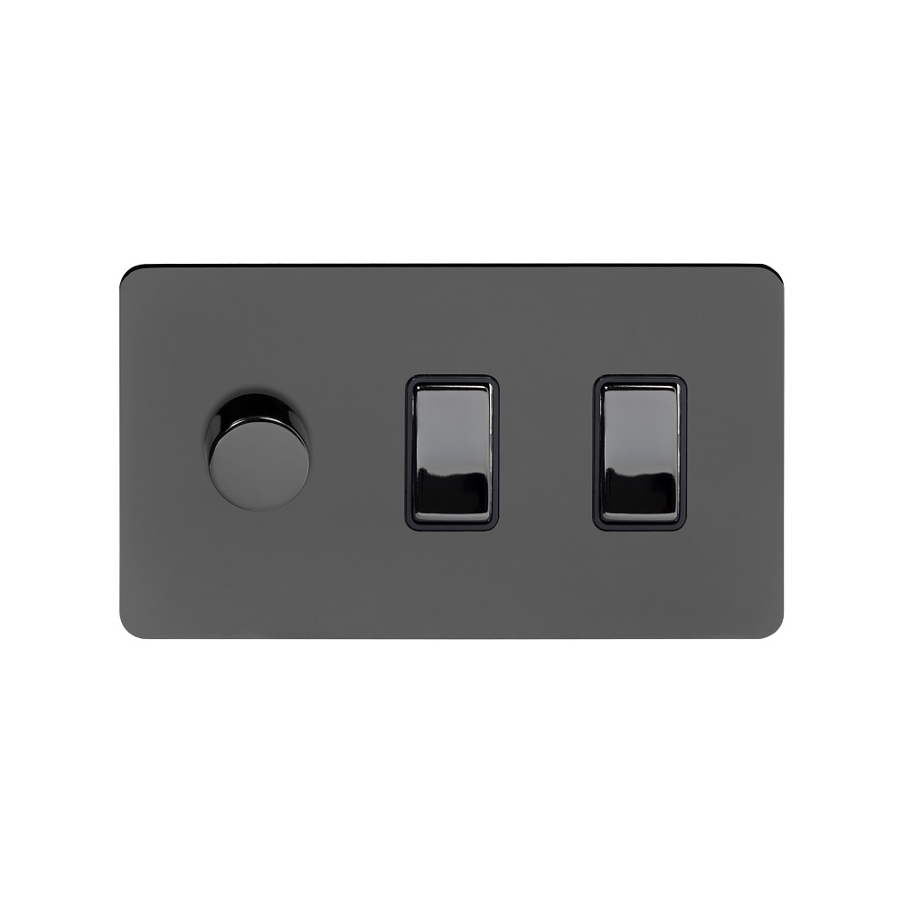 Soho Lighting Black Nickel Flat Plate 3 Gang Dimmer and Rocker Switch Combo (2-Way Intelligent Dimmer & 2 x 2-Way Light Switch) - Size: 86mm x 146mm