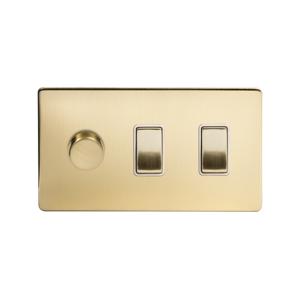 Soho Lighting Brushed Brass 3 Gang Dimmer and Rocker Switch Combo (2-Way Intelligent Dimmer & 2 x 2-Way Light Switch) - Size: H 86mm X W 146mm X D 4.
