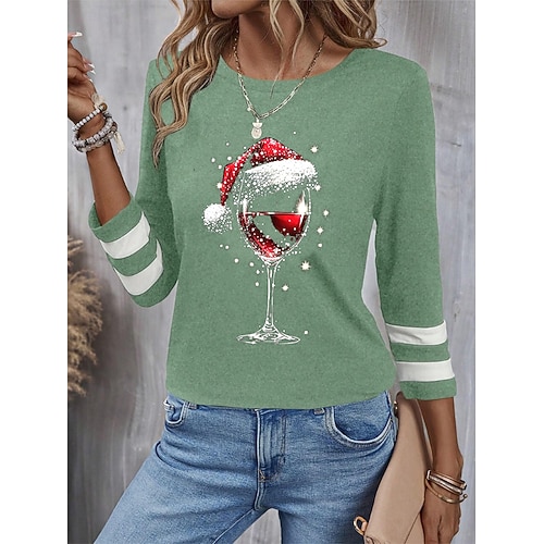 Camicia Blusa Donna Natale Bicchiere di Vino Casual Manica Lunga Collo Crew Regular Tops Quotidiana Patchwork Nera Vino Blu Verde Autunno Inverno