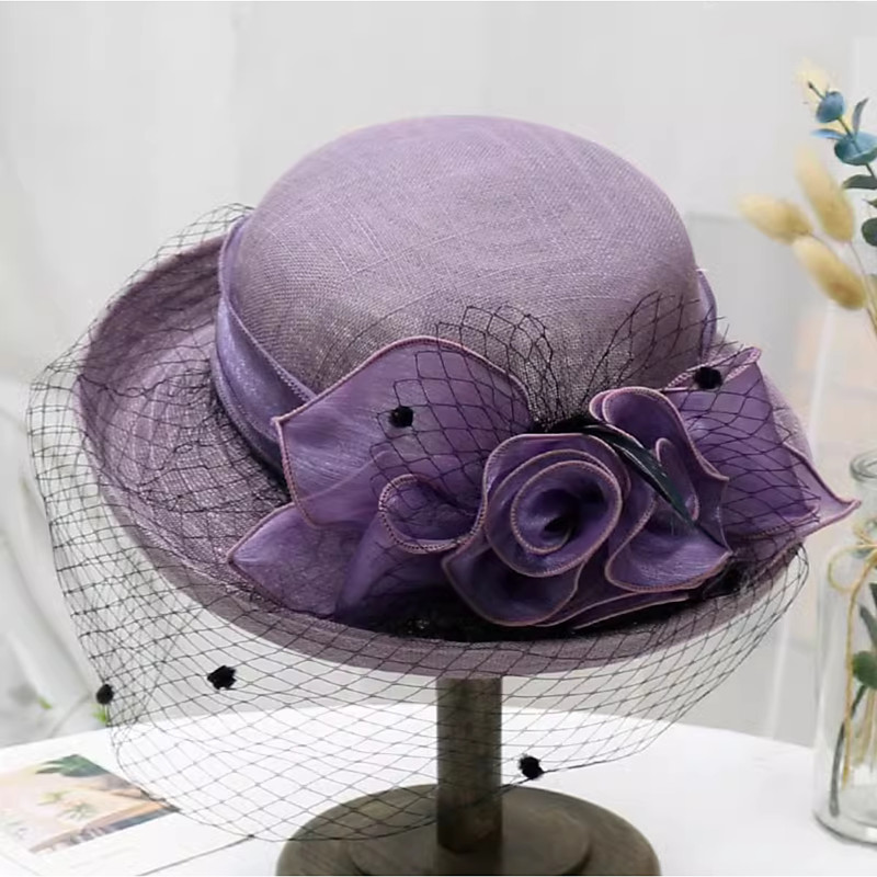Women Wide Brim Bowler Hat Vintage Floral Wool Felt Fedora Floppy Elegant Fascinator Hat with Veil Lady Church Party Bucket