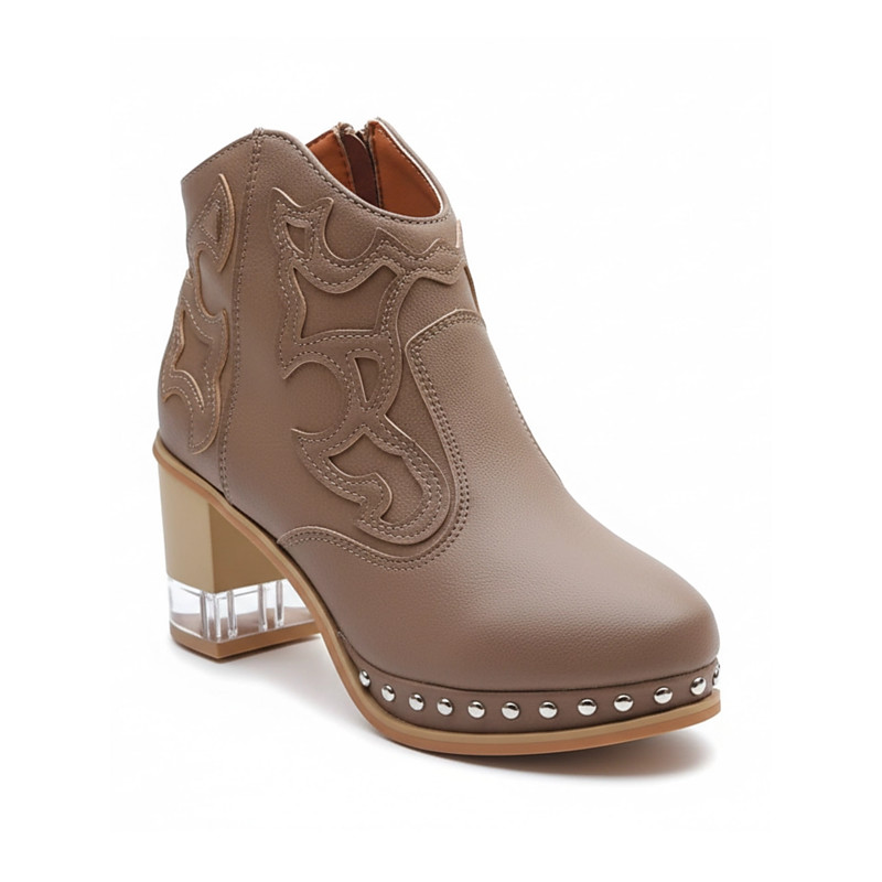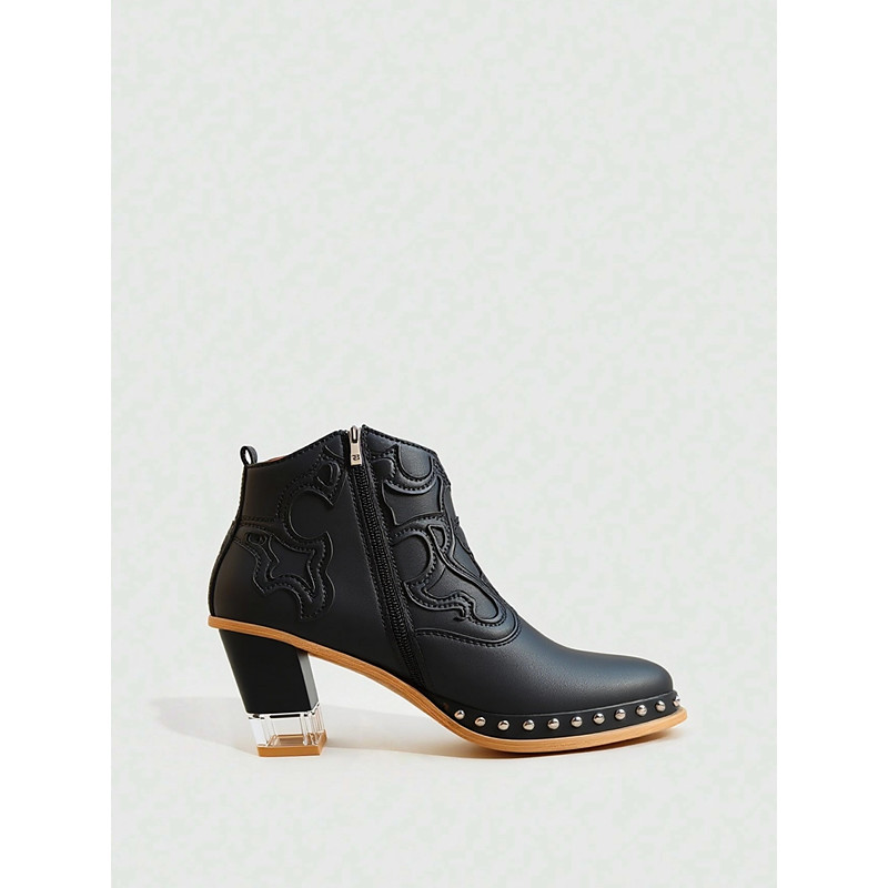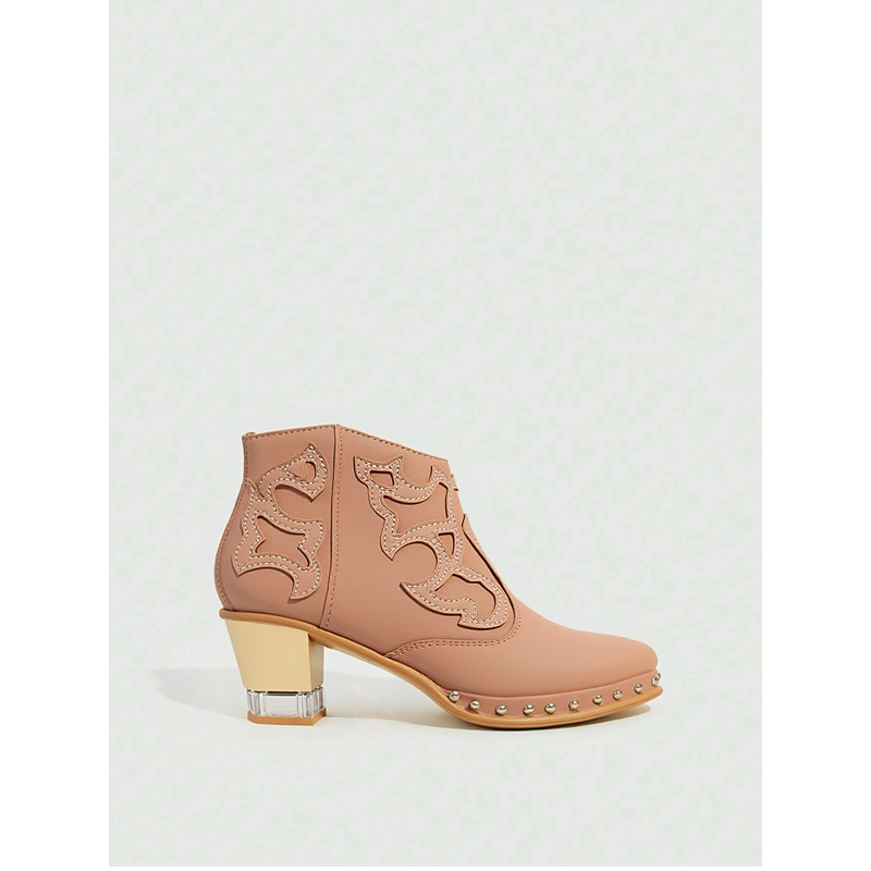 Women's White Leather Western Ankle Boots - Studded Trim, Embroidered Design, and Chunky Wooden Heel for Trendy Casual Outfits