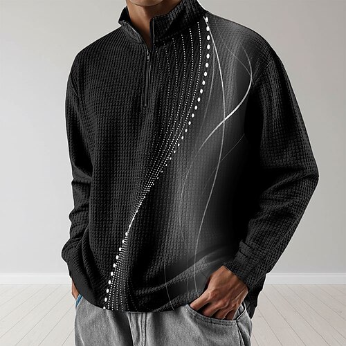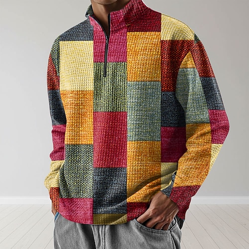 Per uomo Geometrico Plaid Nido d'ape Felpa Moda Quotidiano Classico Casual Collo alla coreana Zip a un quarto All'aperto Casa Ufficio Lavoro Blu Marrone Verde Grigio Con zip Autunno Inverno