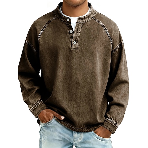 Per uomo Maglietta Maglia Henley Camicia 100% cotone lavaggio acido Manica Lunga Collo alla coreana Henley Estate Primavera Autunno Semplice Vintage Streetwear Casual Lavato Manica corta Casuale Casa