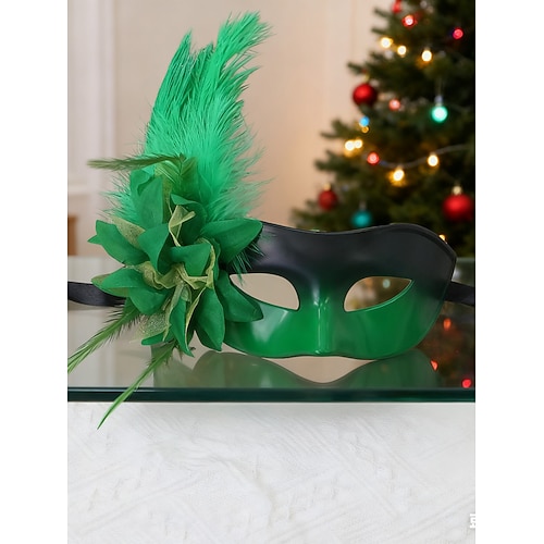 maschera da donna in piume verdi con decorazione floreale per feste di Natale, ballo carnevale