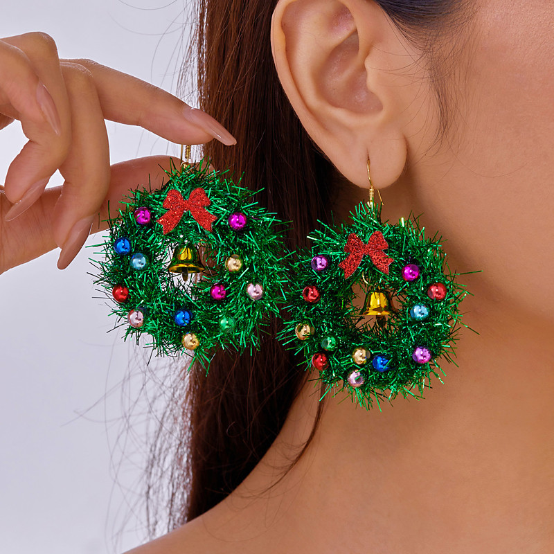 Christmas Wreath Dangle Earrings with Red Bow and Gold Bell Charm – Festive Holiday Jewelry for Women