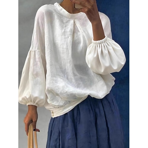 Per donna Camicie di cotone e lino Tinta unica Semplice Elegante Bohemien Vintage Manica Lunga Manica a Palloncino Top Regolari Quotidiano Lavoro Ferie Marrone rossastro Bianco Rosa Azzurro cielo