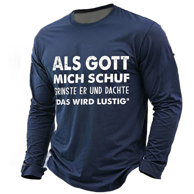 Maglietta grafica a maniche lunghe da uomo divertente slogan tedesco 'Quando Dio mi ha creato ha sorriso e pensato che sarebbe stata un'avventura divertente'