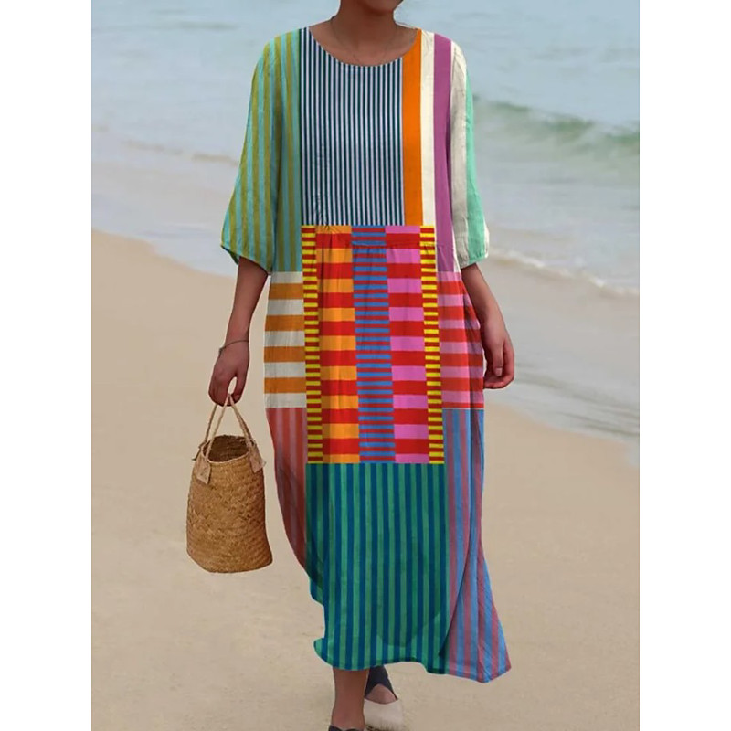 Women's Maxi Dress Kaftan 3/4 Length Sleeve Crew Neck Casual Shift Dress A Line Dress Dress Boho Daily Date Going out Geometric Dark Brown Yellow Red Purple