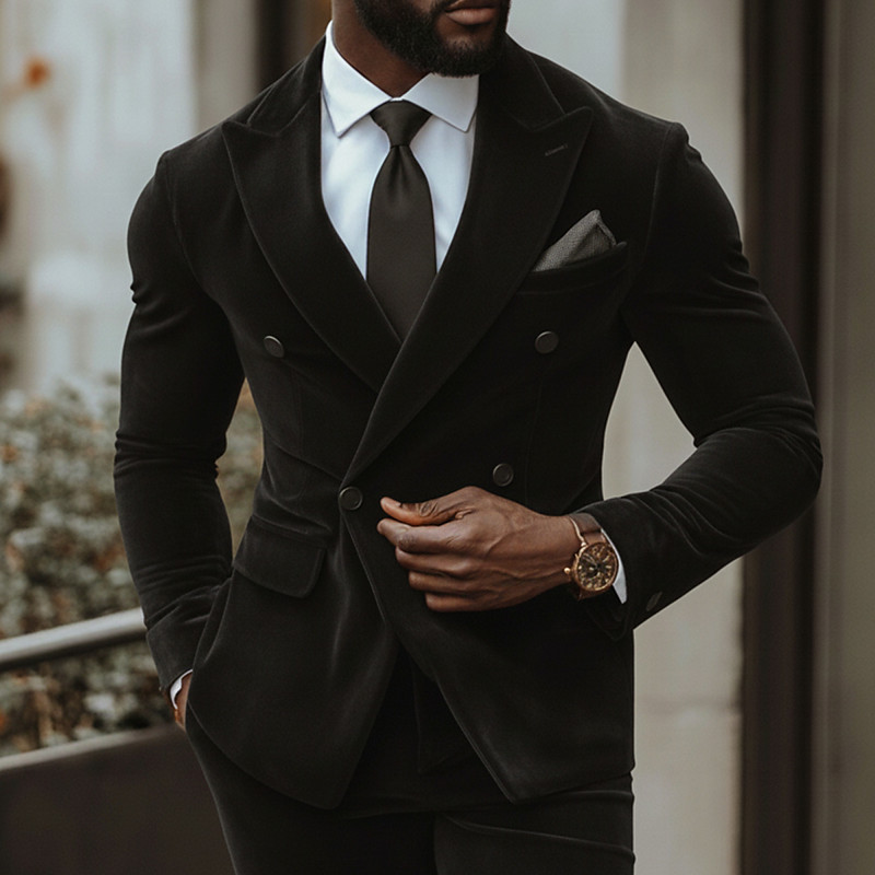 Men's Casual Business Velvet Suits Notch Lapel Black Brown Formal Solid Colored Tailored Fit 2 Piece Double Breasted Four-buttons
