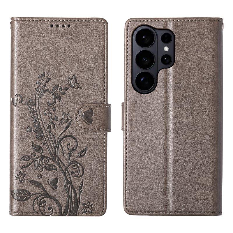 Samsung Galaxy S26 Ultra Plånboksfodral Konstläder Blomtryck - Grå