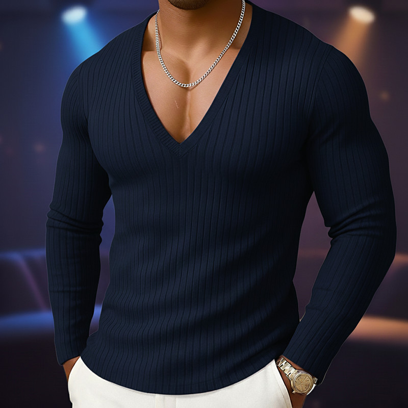 Men's T Shirt Ribbed Knit tee Tee Top Long Sleeve Shirt Long Sleeve Deep V Spring Fall Winter Solid Color Plain Pit Strip Fashion Designer Basic Knitting Vacation Street Casual White Navy Blue Blue
