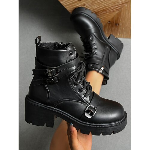 stivali da combattimento con tacco grosso marrone scuro da donna: stivaletti alla caviglia con lacci e cinturini con fibbia, calzature autunnali alla moda per streetwear e outfit quotidiani