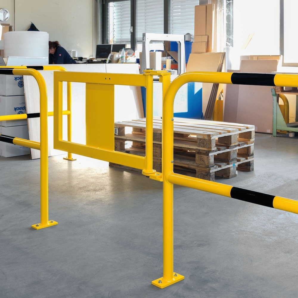 PROREGAL Schutzbügel mit Tür & Gasdruckfeder-Öffnung | HxB 100x192cm | Maße Tür HxB 52x90,5cm | Rohr-Ø 4,8cm | Kunststoffbeschichteter Stahl | Gelb