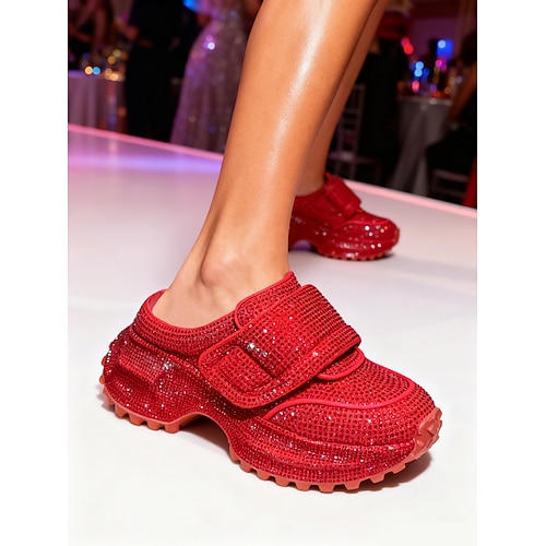 sneakers da donna con plateau e strass rossi, scarpe da festa slip-on robuste per eventi notturni